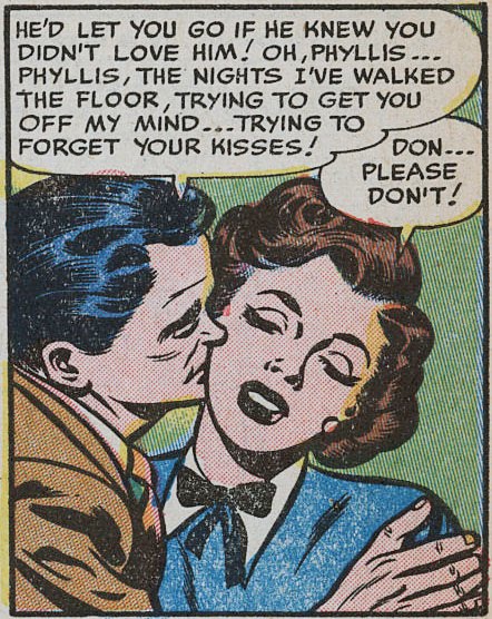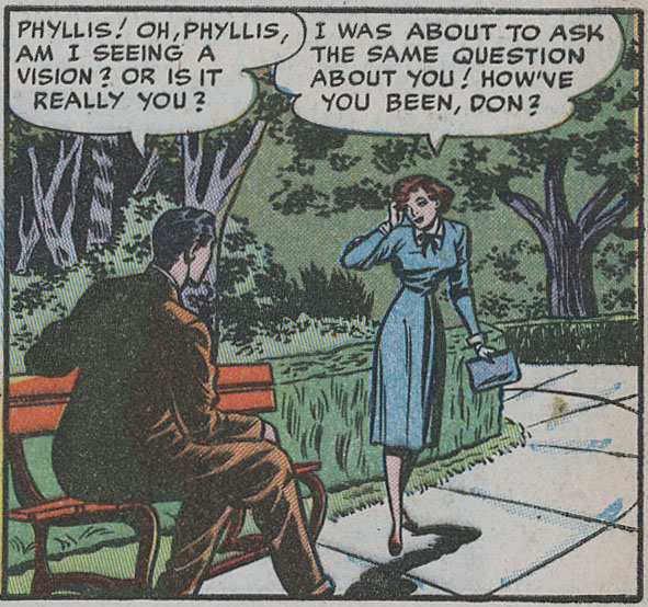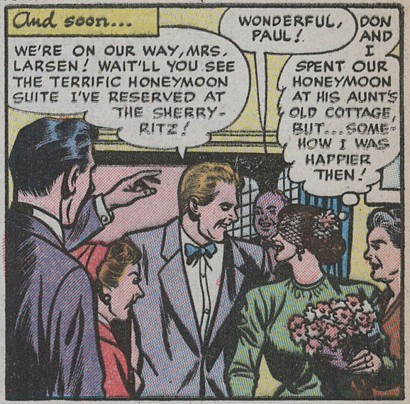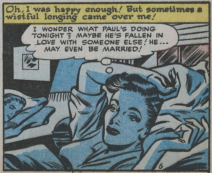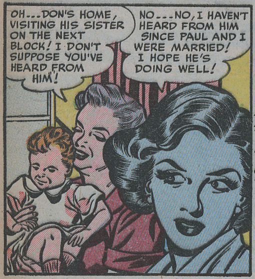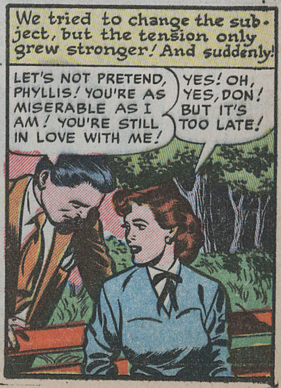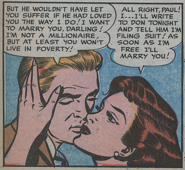 This is the point at which the story veers into territory that wouldn't be permissible after the Comics Code, 'with its strict rules about the depiction of marriage', as Michelle Nolan noted. In particular, divorce could not be depicted as desirable, and the above image of the married woman kissing another man would be unacceptable. But in 1953, Phyllis gets a divorce so she can marry Paul: