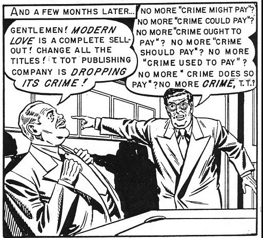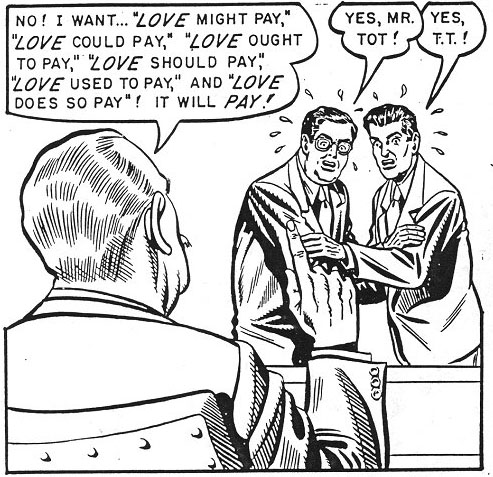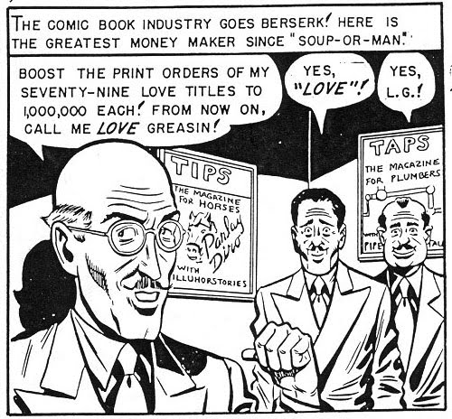 Here's Lev Gleason (Love Greasin), publisher of the enormously successful first Crime comic, Crime Does Not Pay. He actually only published two romance titles, one of which would run for 57 issues all the way into 1956.