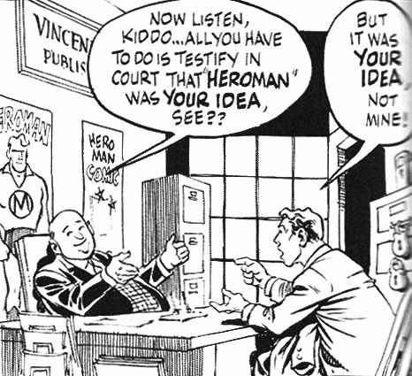 "The man was insane, absolutely insane. He would go off on a speech like, “I’m the King of the Comics, and I’m not playing school here with chalk on the blackboard, I’ve got millions of dollars tied up in this business!…The man was mad.” He was a “short, round, nattily dressed man in his late forties, with a rasping voice that would shrill to frightening crescendos when he was excited. And he was excited often."Like the EC chaps, Will Eisner also drew Fox under a pseudonym, Vincent Reynard. This was in his 1986 book The Dreamer and accounted for Fox's earlier bandwagon jumping when he published an imitation of Superman , titled Wonderman (here changed to Heroman, just to help muddle our memories forever) and got thoroughly sued for it.