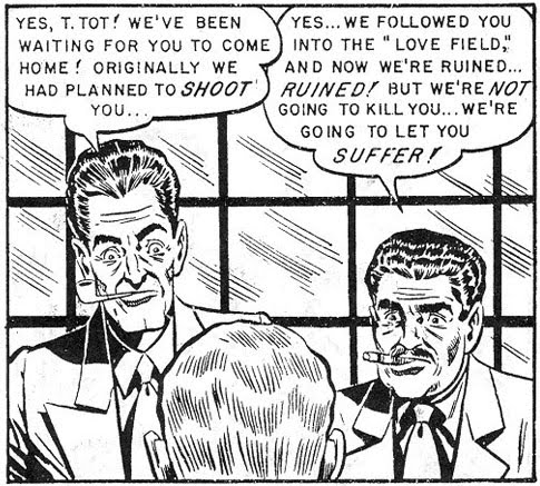 Modern Love #8, Aug 1950In which they reveal quite early their delight in mockery that would later be their salvation. In the oddest story ever to appear in a romance comic, Gaines and Feldstein lampooned the Love Glut. It was drawn by Feldstein in his usual charmless and wooden manner. The old geezer on the left is supposedly the EC publisher; he's having an affair with a sweet young thing and he has decided to put love into the comics: