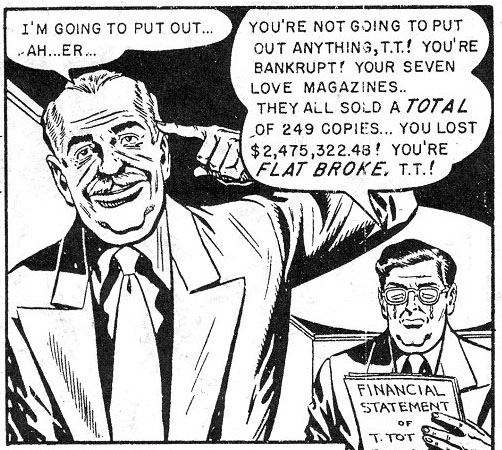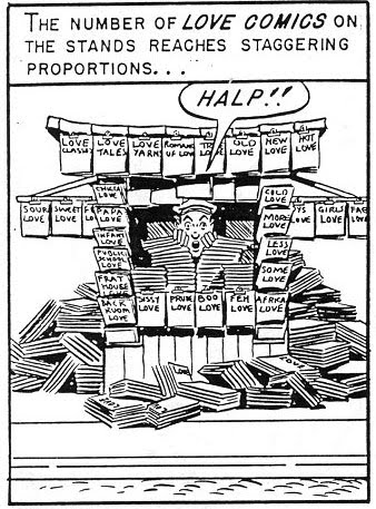 You don't need a business degree to know it was all bound to go wrong. The funniest account of the glut and the fall-out appeared in, of all places, a romance comic book. Publisher EC's contribution to the love genre was remarkably restrained and also short-lived. It consisted of fifteen issues under three different titles. This was their final offering.