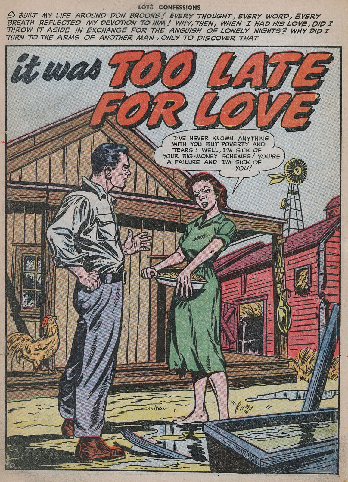 Love Confessions #29, Apr 1953, lead story, 9 pagesAs to who wrote it, we'll never know. There are many instances in art history of which all we know is what we can glean from the body of written complaint that accompanies every age. Take, for example, this passage from Frederic Wertham's Seduction of the Innocent, published in 1954, the year after the story under current scrutiny:
